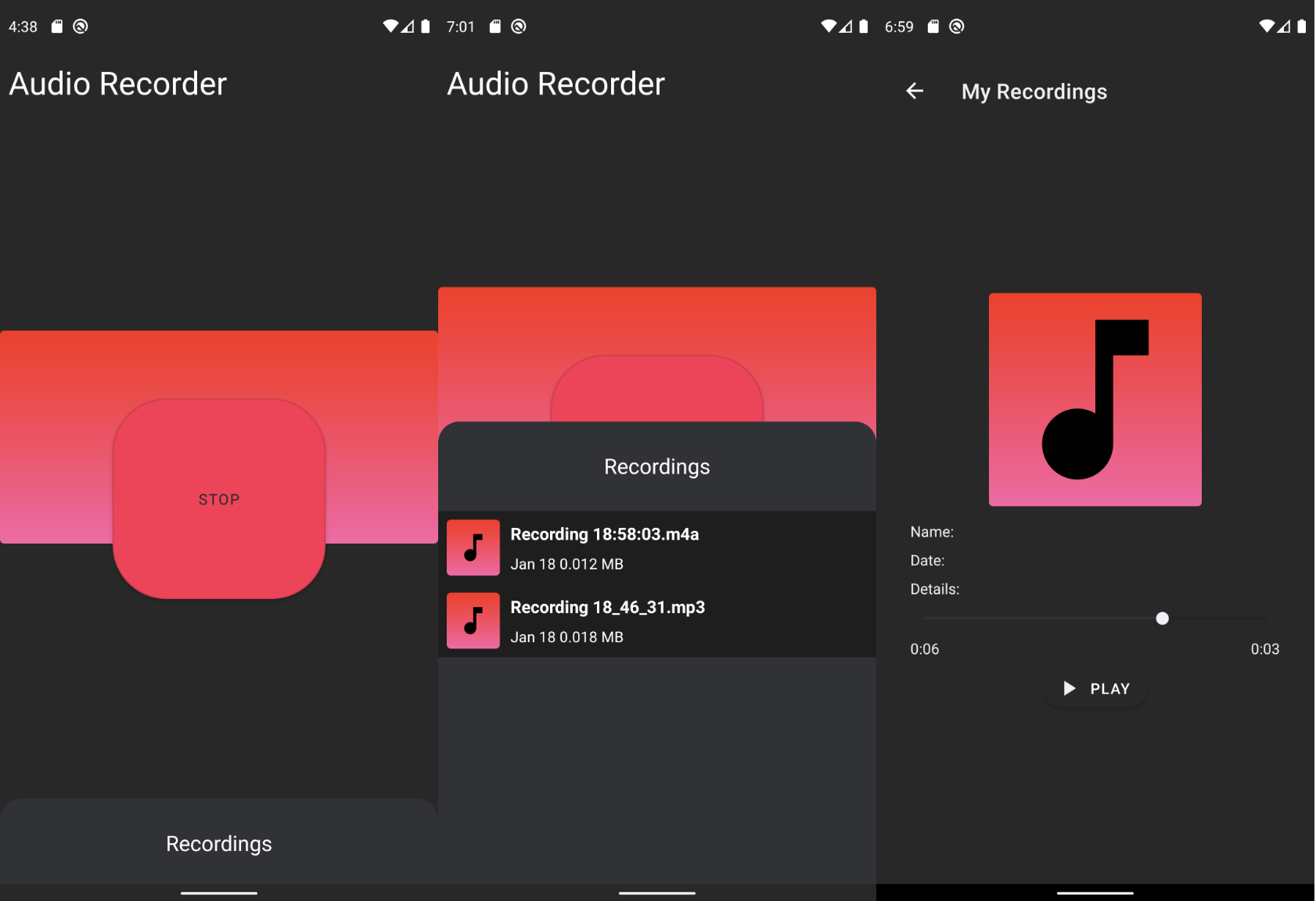 This is a beautiful Android audio recorder offering a simplistic design and using Google's Material Design Components. The app is built using Android Architectural Components MVVM and live data.